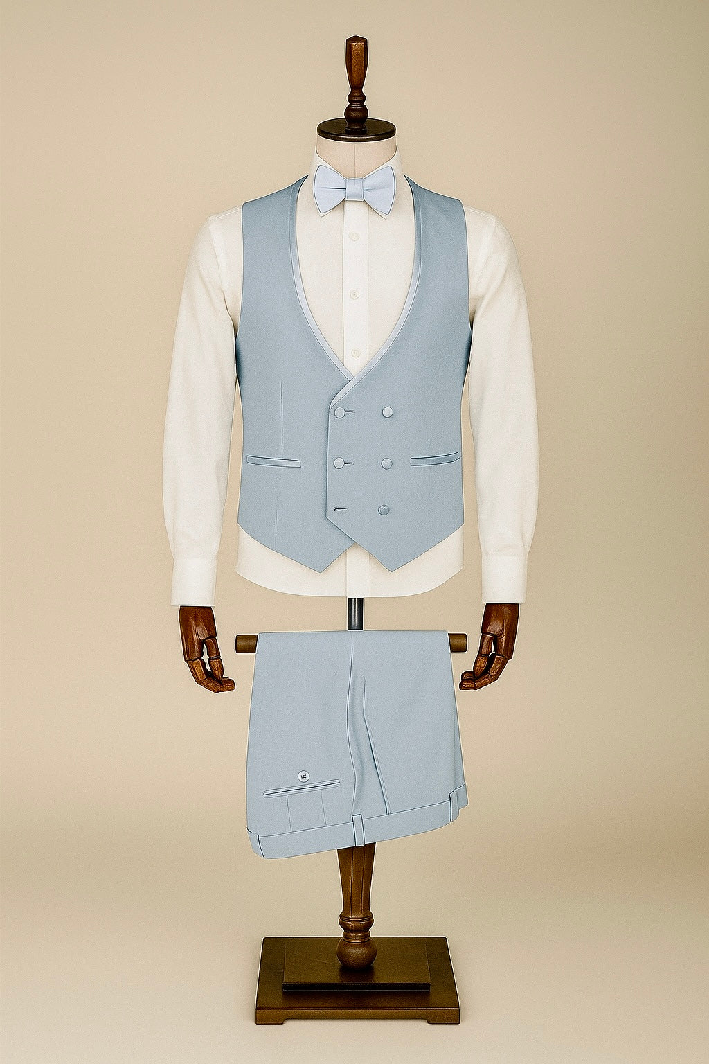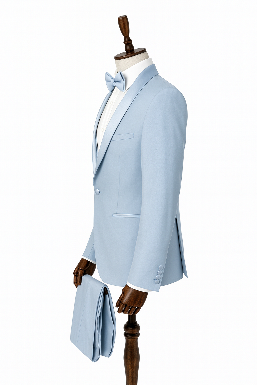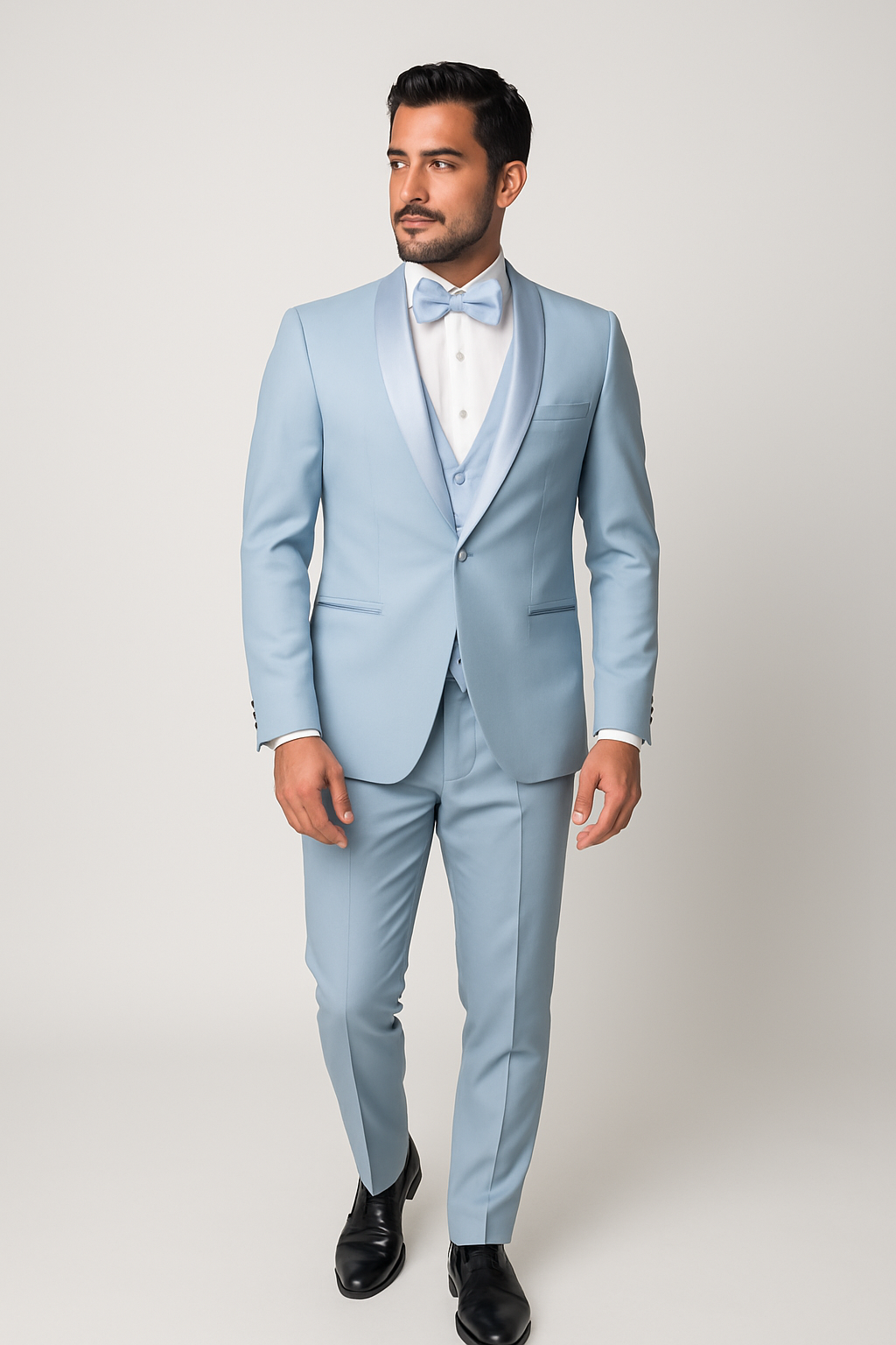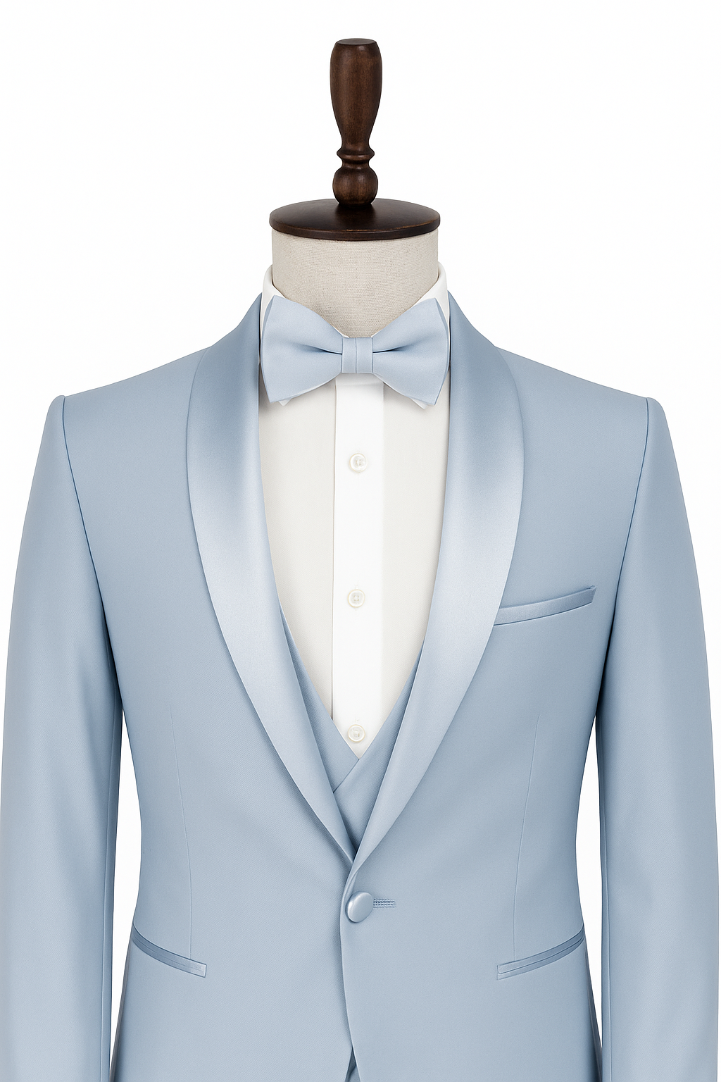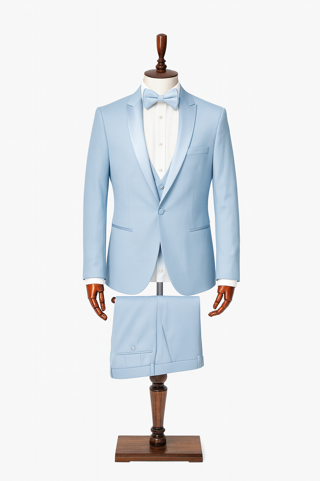 Setze ein Statement mit diesem exklusiven Smoking in Hellblau. Das 3-teilige Set besteht aus Sakko, Weste und Hose und wird mit passender Fliege geliefert. Der moderne Slim-Fit-Schnitt und die hochwertige Verarbeitung sorgen für einen eleganten Look, der nicht nur bei Hochzeiten, Bällen oder Gala-Events, sondern besonders im Sommer perfekt zur Geltung kommt.